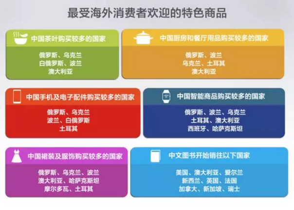 手机、电脑和网络产品、电子配件、家居用品是最受海外市场欢迎的中国商品。近两年,智能产品、汽车配件、运动户外、美容健康是海外销售占比增长最为亮眼的品类。从增速来看,2017年1月至4月,消费额同比去年增速最快的13个国家中,有7个“一带一路”沿线国家,消费额同比平均增速超过10倍。