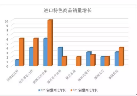 进口商品中,食品、酒类、家纺、水果、钟表、海产是“一带一路”相关国家进口销量最高的品类。作为2016年的水果明星,智利车厘子、墨西哥牛油果等在2016年走进了中国的千家万户。此外,阿根廷红虾、厄瓜多尔白虾等进口海产也走上了百姓餐桌,特别是各种节日期间,销量大幅上升。菲律宾7D芒果干、印尼进口果蔬干、丽芝士,越南进口LIPO面包干等食品也畅销全国,成为广受城市消费者喜爱的休闲零食。